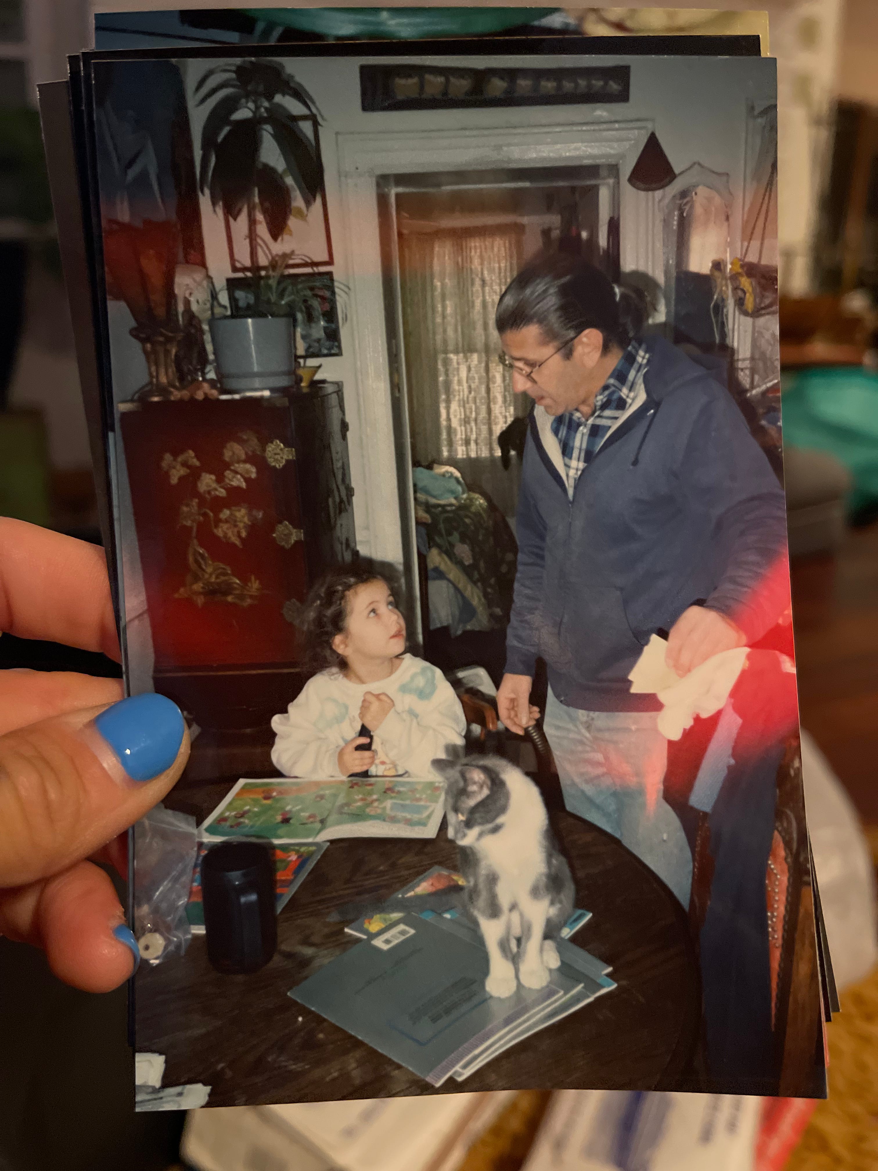 I sorted through the images on my living room floor. Pictures of my father and I together, which I couldn’t remember ever seeing before, surfaced unexpectedly. Us at my 7th birthday party, swimming in the pool at the YMCA; me sitting on his lap on Christmas Eve beside a pile of presents, he embraced me in a hug. I placed the picture of us next to the Christmas presents on my coffee table. An hour later I walked past it and, saddened by the image and annoyed by my sadness, flipped it face down. Later that evening, I turned it face up again.